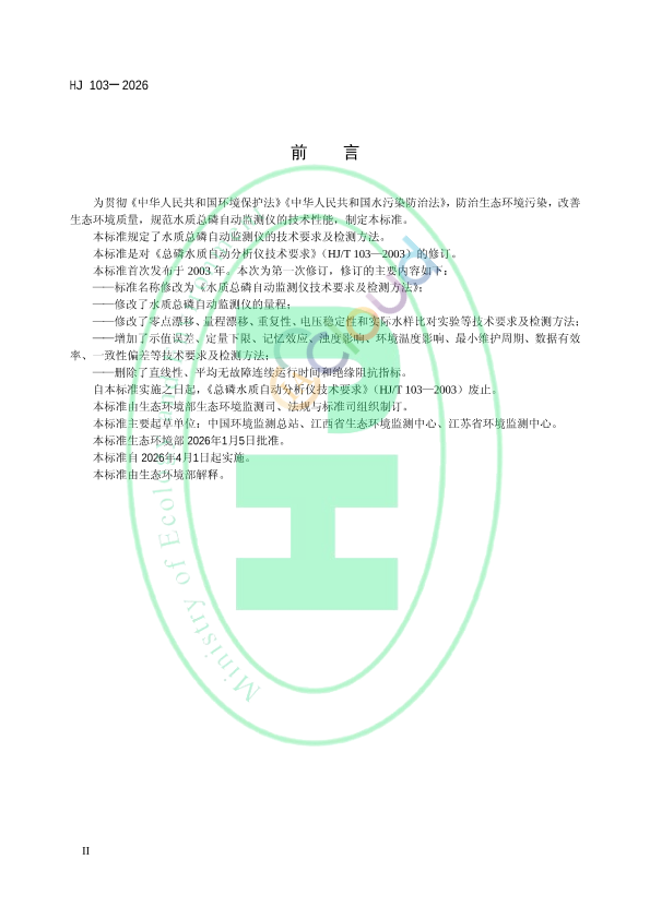 为贯彻《中华人民共和国环境保护法》《中华人民共和国水污染防治法》,防治生态环境污染,改善生态环境质量,规范水质总磷自动监测仪的技术性能,制定本标准。 本标准规定了水质总磷自动监测仪的技术要求及检测方法。 本标准是对《总磷水质自动分析仪技术要求》(HJ/T 103—2003)的修订。