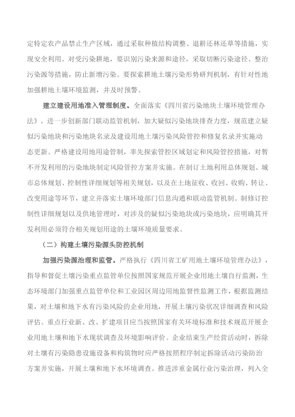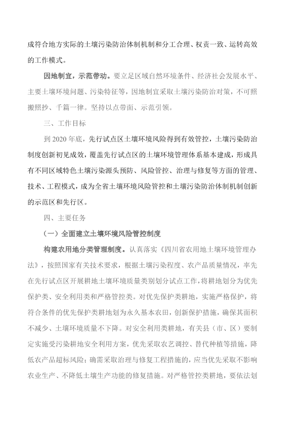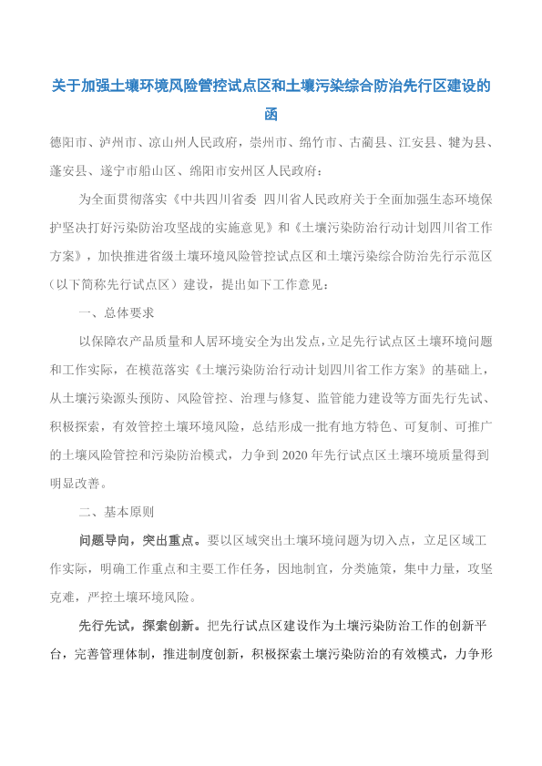 德阳市、泸州市、凉山州人民政府,崇州市、绵竹市、古蔺县、江安县、犍为县、蓬安县、遂宁市船山区、绵阳市安州区人民政府: 为全面贯彻落实《中共四川省委 四川省人民政府关于全面加强生态环境保护坚决打好污染防治攻坚战的实施意见》和《土壤污染防治行动计划四川省工作方案》,加快推进省级土壤环境风险管控试点区和土壤污染综合防治先行示范区(以下简称先行试点区)建设,提出如下工作意见