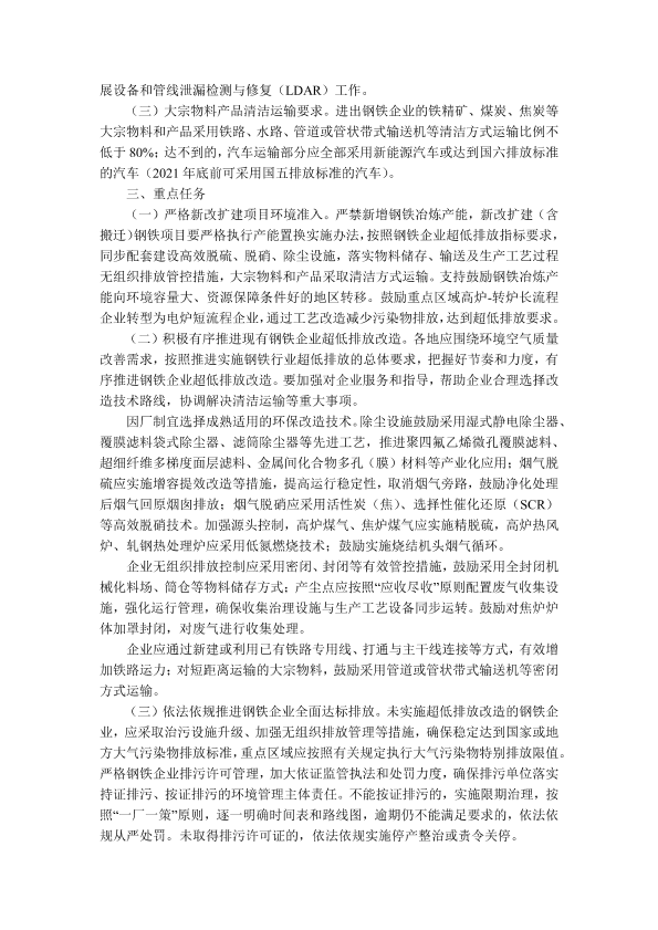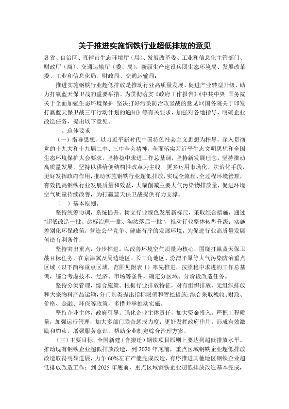 各省、自治区、直辖市生态环境厅(局)、发展改革委、工业和信息化主管部门、财政厅(局)、交通运输厅(委、局),新疆生产建设兵团生态环境局、发展改革委、工业和信息化局、财政局、交通运输局: 推进实施钢铁行业超低排放是推动行业高质量发展、促进产业转型升级、助力打赢蓝天保卫战的重要举措。为贯彻落实《政府工作报告》《中共中央 国务院关于全面加强生态环境保护 坚决打好污染防治攻坚战的意见》《国务院关于印发打赢蓝天保卫战三年行动计划的通知》等有关要求,加强对各地指导,明确企业改造任务,提出以下意见。