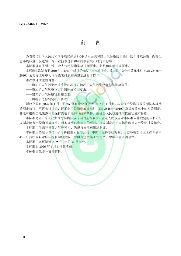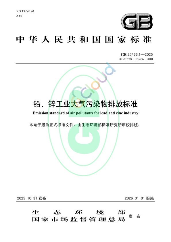 为贯彻《中华人民共和国环境保护法》《中华人民共和国大气污染防治法》,防治环境污染,改善生态环境质量,促进铅、锌工业技术进步和可持续发展,制定本标准。 本标准规定了铅、锌工业大气污染物排放控制要求、监测和监督管理要求。 本标准首次发布于 2010 年,2013 年进行了修改,本次对《铅、锌工业污染物排放标准》(GB 25466—2010)及其修改单中大气污染物排放相关规定进行了修订。本次修订的主要内容: ——增加了大气污染物排放控制项目,加严了大气污染物有组织排放限值; ——增加了大气污染物无组织排放控制要求; ——完善了大气污染物监测要求; ——明确了达标判定相关要求。 新建企业自 2026 年 1 月 1 日起,现有企业自 2027 年 7 月 1 日起,其大气污染物排放控制按本标准的规定执行,不再执行《铅、锌工业污染物排放标准》(GB 25466—2010)及其修改单中的相关规定。各地可根据当地生态环境保护需要和经济与技术条件,由省级人民政府批准提前实施本标准。 本标准是铅、锌工业大气污染物排放控制的基本要求。省级人民政府对本标准未作规定的项目,可以制定地方污染物排放标准;对本标准已作规定的项目,可以制定严于本标准的地方污染物排放标准。 本标准由生态环境部大气环境司、法规与标准司组织制订。 本标准主要起草单位:矿冶科技集团有限公司、中国环境科学研究院、生态环境部环境工程评估中心、广西壮族自治区环境科学研究院、中国有色金属工业协会、中国环境监测总站。 本标准生态环境部 2025 年 10 月 31 日批准。 本标准自 2026 年 1 月 1 日起实施。 本标准由生态环境部解释。