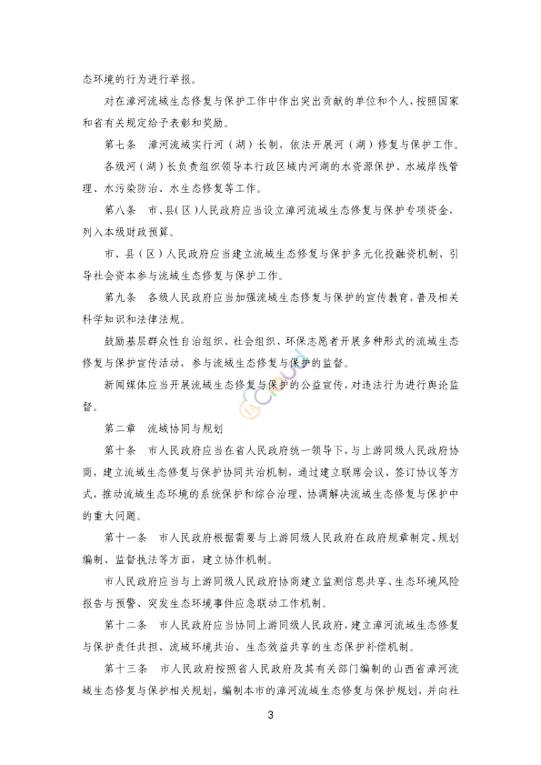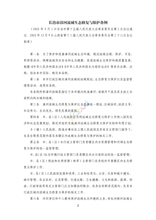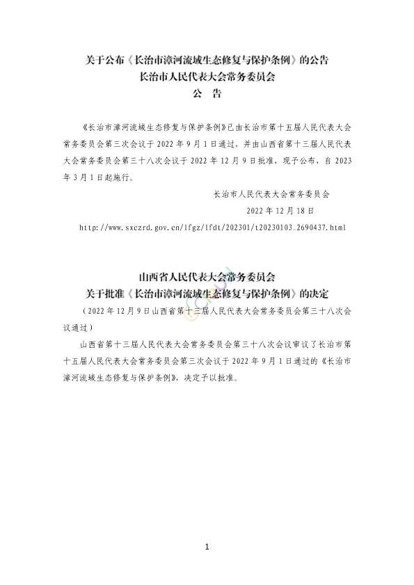 《长治市漳河流域生态修复与保护条例》已由长治市第十五届人民代表大会常务委员会第三次会议于2022年9月1日通过,并由山西省第十三届人民代表大会常务委员会第三十八次会议于2022年12月9日批准,现予公布,自2023年3月1日起施行。 长治市人民代表大会常务委员会 2022年12月18日