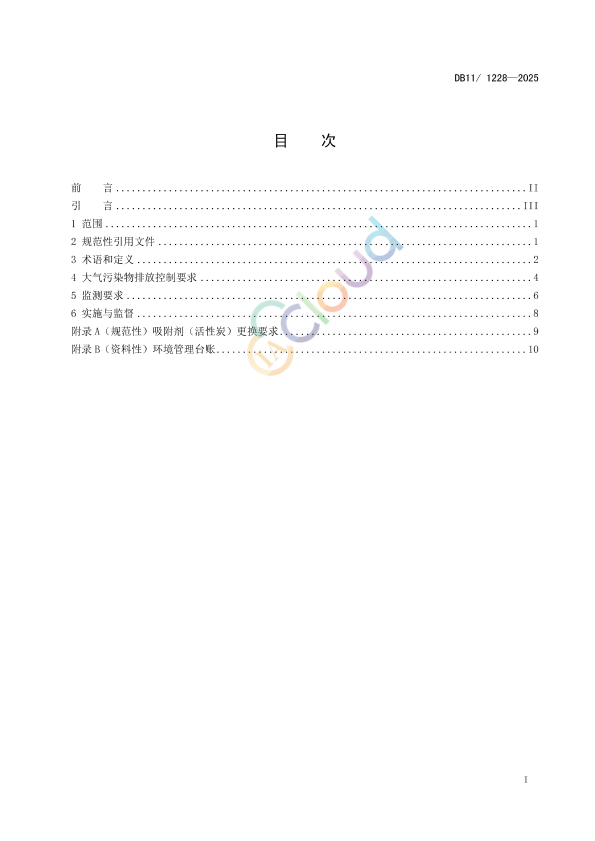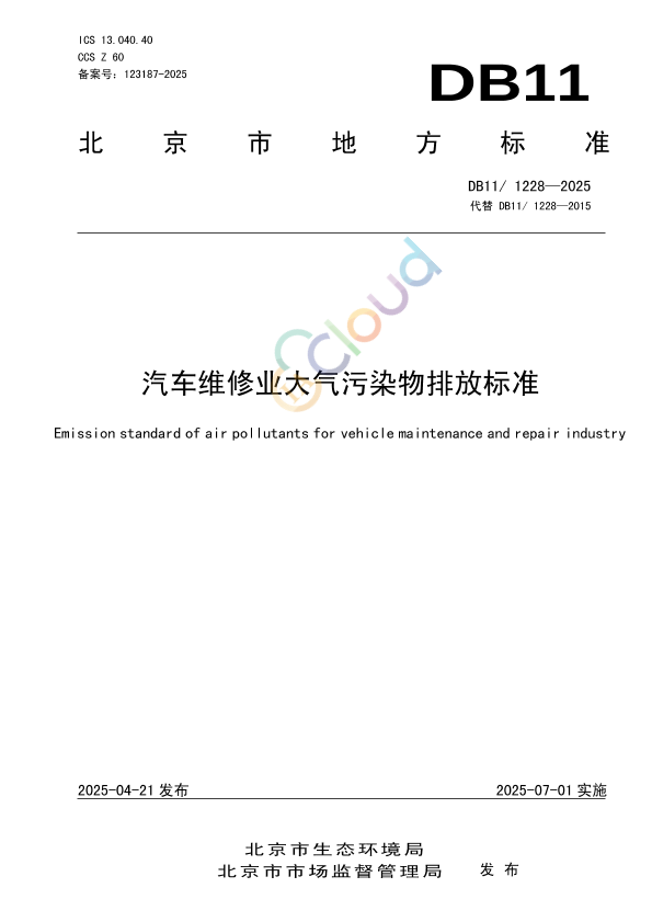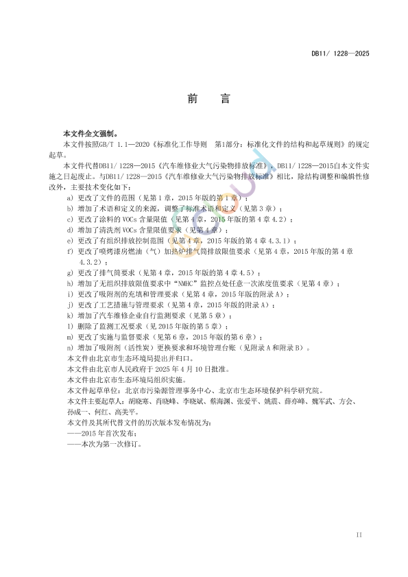 本文件全文强制。 本文件按照GB/T1.1—2020《标准化工作导则第1部分:标准化文件的结构和起草规则》的规定起草。 本文件代替DB11/ 1228—2015《汽车维修业大气污染物排放标准》,DB11/ 1228—2015自本文件实施之日起废止。与DB11/ 1228—2015《汽车维修业大气污染物排放标准》相比,除结构调整和编辑性修改外,主要技术变化如下: a) 更改了文件的范围(见第 1 章,2015 年版的第 1 章); b) 增加了术语和定义的来源,调整了标准术语和定义(见第 3 章); c) 更改了涂料的 VOCs 含量限值(见第 4 章,2015 年版的第 4 章 4.2); d) 增加了清洗剂 VOCs 含量限值要求(见第 4 章); e) 更改了有组织排放控制范围(见第 4 章,2015 年版的第 4 章 4.3.1); f) 更改了喷烤漆房燃油(气)加热炉排气筒排放限值要求(见第 4 章,2015 年版的第 4 章4.3.2); g) 更改了排气筒要求(见第 4 章,2015 年版的第 4 章 4.5); h) 增加了无组织排放限值要求中“NMHC”监控点处任意一次浓度值要求(见第 4 章); i) 更改了吸附剂的充填和管理要求(见第 4 章,2015 年版的附录 A); j) 更改了工艺措施与管理要求(见第 4 章,2015 年版的附录 A); k) 增加了汽车维修企业自行监测要求(见第 5 章); l) 删除了监测工况要求(见 2015 年版的第 5 章); m) 更改了实施与监督要求(见第 6 章,2015 年版的第 6 章); n) 增加了吸附剂(活性炭)更换要求和环境管理台账(见附录 A 和附录 B)。 本文件由北京市生态环境局提出并归口。 本文件由北京市人民政府于 2025 年 4 月 10 日批准。 本文件由北京市生态环境局组织实施。 本文件起草单位:北京市污染源管理事务中心、北京市生态环境保护科学研究院。 本文件主要起草人:胡晓寒、肖晓峰、李晓斌、蔡海渊、张爱平、姚震、薛亦峰、魏军武、方会、孙成一、何红、高美平。 本文件及其所代替文件的历次版本发布情况为: ——2015 年首次发布; ——本次为第一次修订。