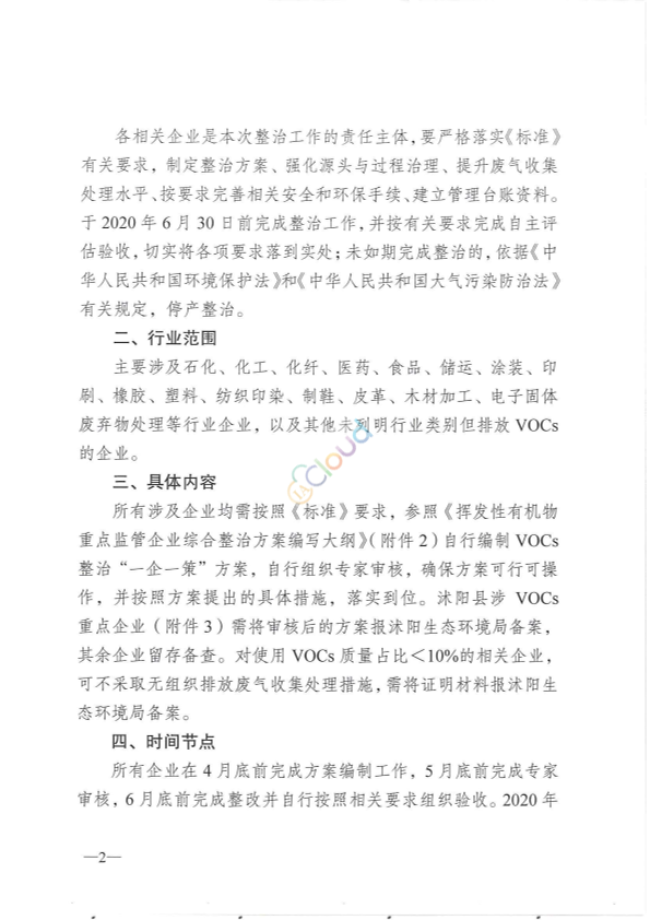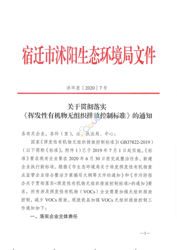 各有关企业,各科(室),站、执法局、中心: 国家《挥发性有机物无组织排放控制标准》(GB37822-2019)(以下简称《标准》,附件1)已于2019年7月1日起实施。《标准》要求现有企业要在2020年6月30日前完成整治任务,新建企业执行新标准。根据《市生态环境局关于转发挥发性有机物重点监管企业综合整治方案编写大纲等文件的通知》和《市污防指办关于贯彻落实<挥发性有机物无组织排放控制标准>的通知》要求,所有涉及挥发性有机物(VOCs)企业需要加强无组织排放控制,减少VOCs排放。现就我县加强VOCs无组织排放控制工作通知如下: