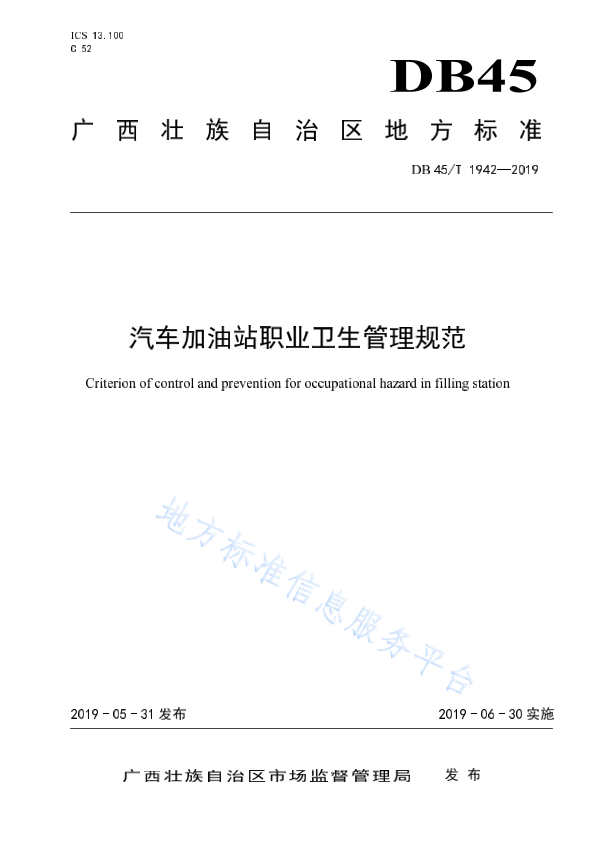 本标准规定了汽车加油站总体布局、职业卫生防护措施、职业卫生管理、有害因素监测、职业健康监护、职业卫生培训、密闭空间作业卫生要求、职业卫生档案管理以及对劳动者的要求。 本标准适用于广西境内汽车加油站职业卫生的管理。