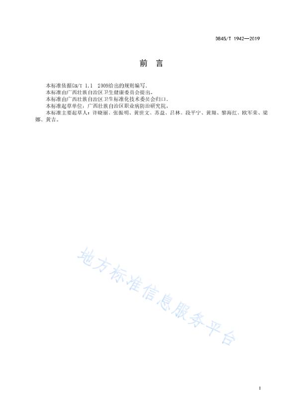 本标准依据GB/T1.1一2009给出的规则编写。 本标准由广西壮族自治区卫生健康委员会提出。 本标准由广西壮族自治区卫生标准化技术委员会归口。 本标准起草单位:广西壮族自治区职业病防治研究院。 本标准主要起草人:许晓丽、张振明、黄世文、苏益、吕林、段平宁、黄翔、黎海红、欧军荣、梁娜、黄吉。