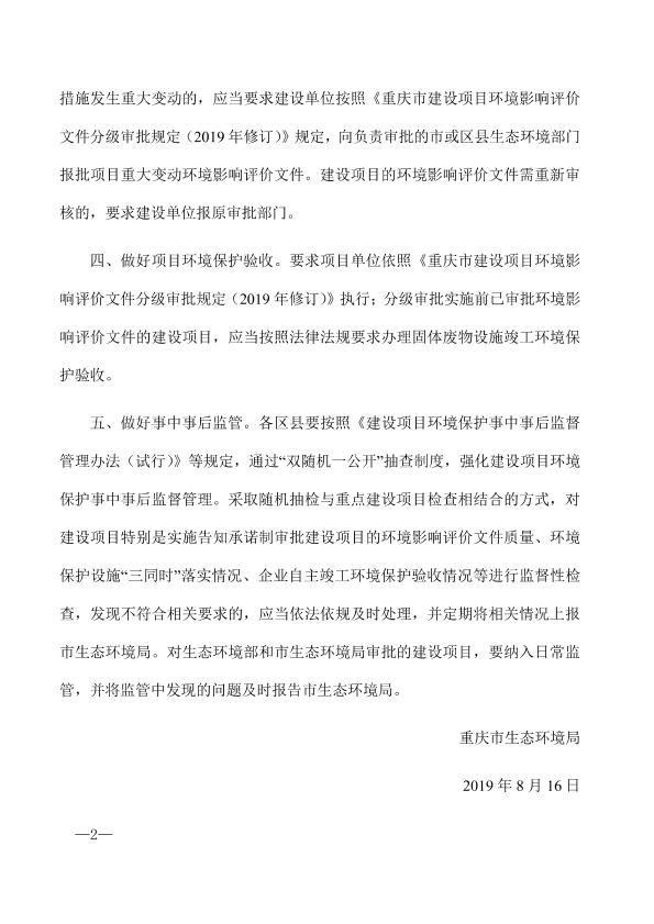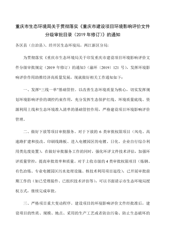 各区县(自治县)、经开区生态环境局,两江新区分局: 为贯彻落实《重庆市生态环境局关于印发重庆市建设项目环境影响评价文件分级审批规定(2019 年修订)的通知》(渝环〔2019〕121 号),发挥环境影响评价作用助推经济高质量发展,现就做好相关工作通知如下: