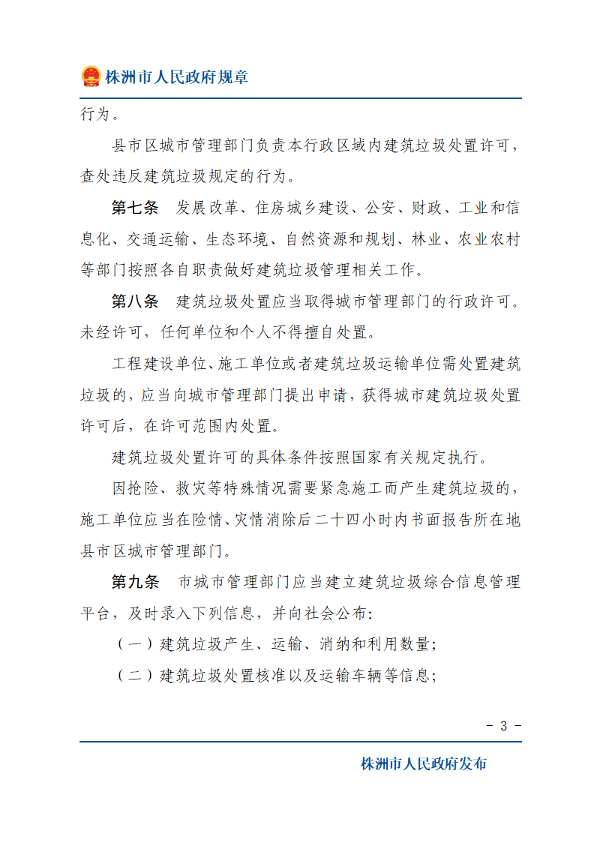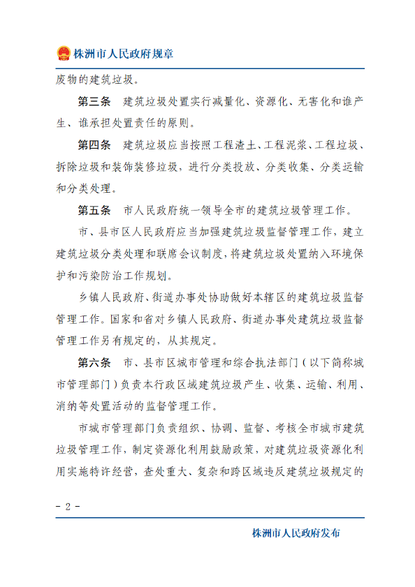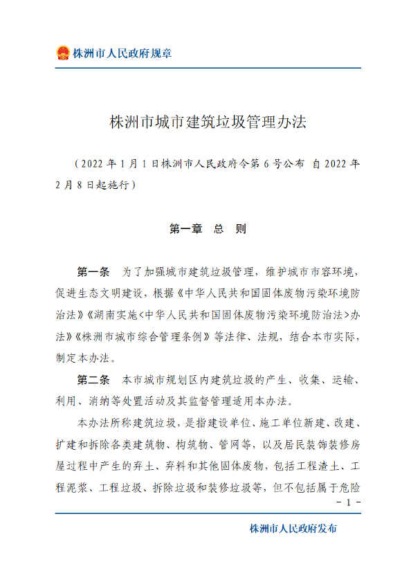 2022年1月1日株洲市人民政府令第6号公布自2022年2月8日起施行。 为了加强城市建筑垃圾管理,维护城市市容环境,促进生态文明建设,根据《中华人民共和国固体废物污染环境防治法》《湖南实施〈中华人民共和国固体废物污染环境防治法〉办法》《株洲市城市综合管理条例》等法律、法规,结合本市实际,制定本办法。