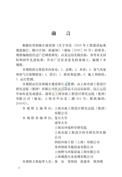 根据住房和城乡建设部《关于印发本规程的主要技术内容是: 1.总则; 2.术语; 3.臭气风量和臭气污染物浓度; 4.设计; 5.排放和监测; 6.施工和验收;7.运行管理。 本规程由住房和城乡建设部负责管理,由上海市政工程设计研究总院(集团)有限公司负责具体技术内容的解释。执行过程中如有意见或建议,请寄送上海市政工程设计研究总院(集团)有限公司(地址:上海市中山北二路901号,邮政编码:200092)。 本规程主编单位:上海市政工程设计研究总院(集团)有限公司 本规程参编单位:复旦大学 清华大学 上海市环境科学研究院 .上海市政工程设计科学研究所有限公司 西原坏保工程(上海)有限公司 苏州顶裕节能设备有限公司 上海野马环保设备工程有限公司 上海城投污水处理有限公司 本规程主要起草人员:张辰 邹伟国 侯惠奇 席劲瑛 付威 张仁熙 王国华 陈芸 陈和谦 裘季冰 周骅 杨彩凤 支霞辉 彭弘 鞠庆玲 李尤龙 张倚马 本规程主要审查人员:杭世玥 羊寿生 吴济华 李树苑 励建全 杨殿海 徐国勋 唐建国 黄民生