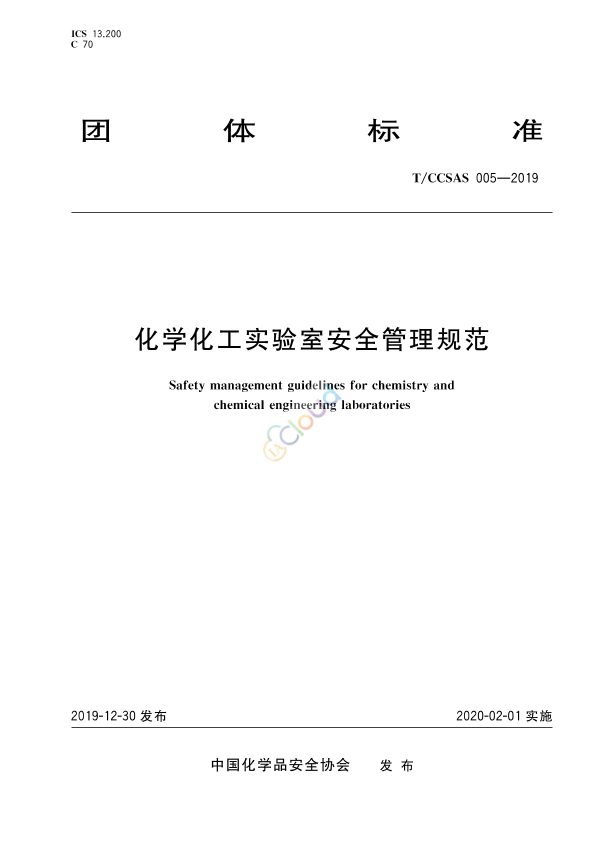本标准规定了化学化工实验室(以下简称“实验室”)安全管理规范,规定了与实验室活动相关的人员、化学品、仪器/设备、设施、环境、安全风险辨识评估与管控以及应急处理等安全管理要求。 本标准适用于化学化工实验室,其他涉及化学品的实验室的安全管理可参照执行。