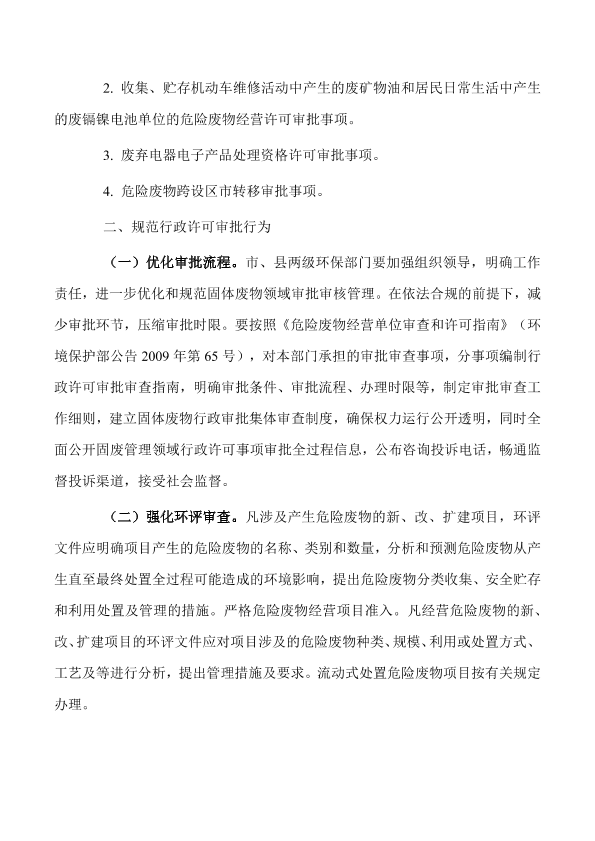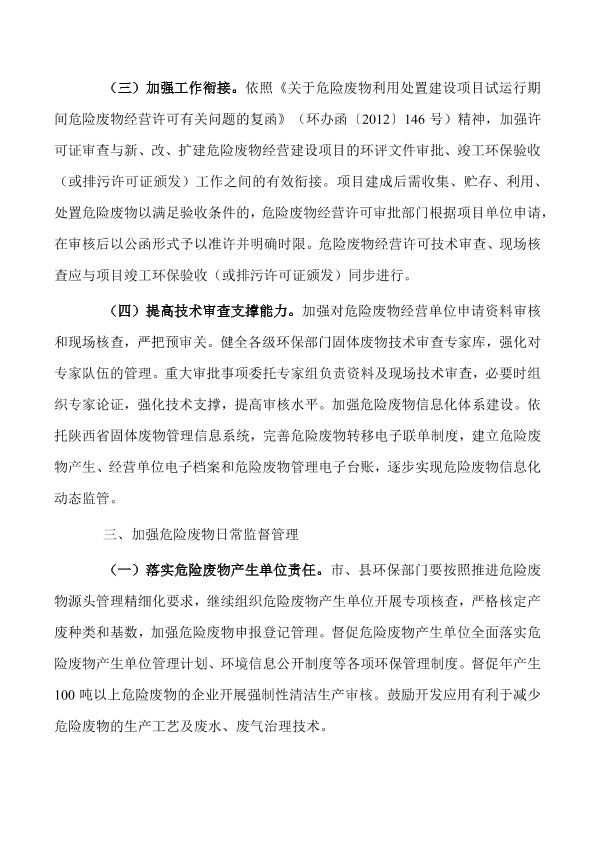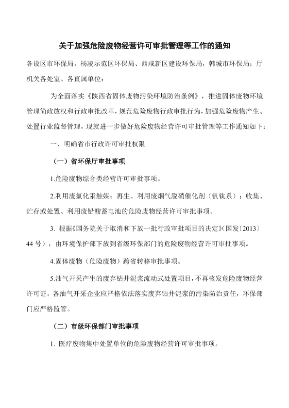 各设区市环保局,杨凌示范区环保局、西咸新区建设环保局,韩城市环保局;厅机关各处室、各直属单位: 为全面落实《陕西省固体废物污染环境防治条例》,推进固体废物环境管理简政放权和行政审批改革,规范危险废物行政审批行为,加强危险废物产生、处置行业监督管理,现就进一步做好危险废物经营许可审批管理等工作通知如下: