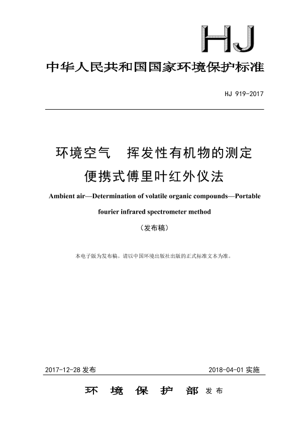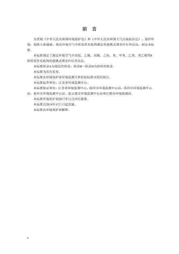 为贯彻《中华人民共和国环境保护法》和《中华人民共和国大气污染防治法》,保护环境,保障人体健康,规范环境空气中挥发性有机物测定的便携式傅里叶红外仪法,制定本标准。 本标准规定了测定环境空气中丙烷、乙烯、丙烯、乙炔、苯、甲苯、乙苯、苯乙烯等8 种挥发性有机物的便携式傅里叶红外仪法。 本标准附录A为规范性附录,附录B~附录D为资料性附录。 本标准为首次发布。 本标准由环境保护部环境监测司和科技标准司组织制订。 本标准起草单位:江苏省环境监测中心。 本标准验证单位:江苏省环境监测中心、扬州市环境监测中心站、苏州市环境监测中心站、泰州市环境监测中心站、连云港市环境监测中心站和江阴市环境监测站。 本标准环境保护部2017年12月28日批准。 本标准自2018年4月1日起实施。 本标准由环境保护部解释。
