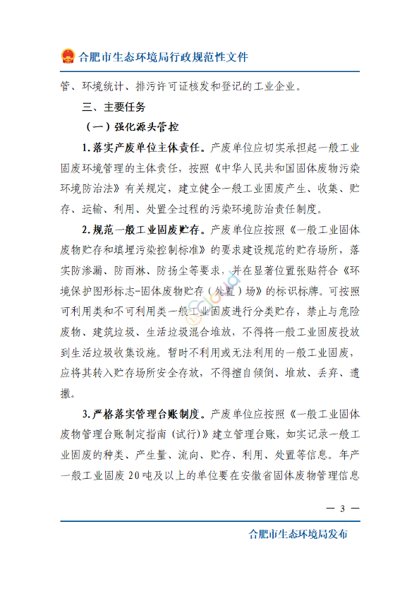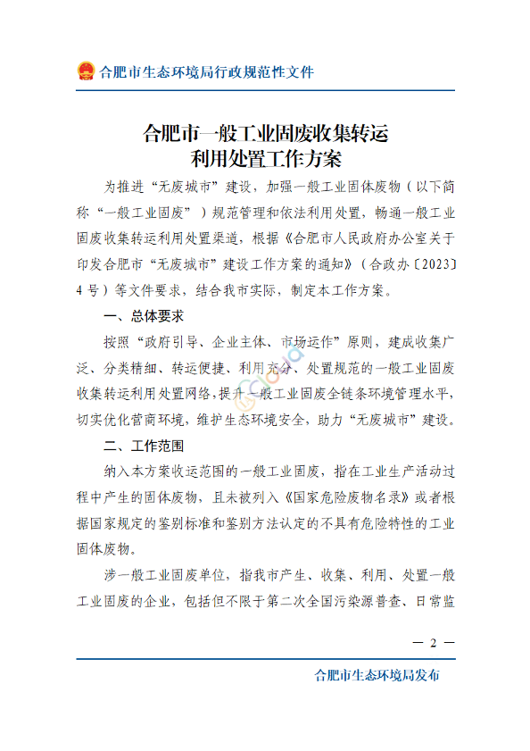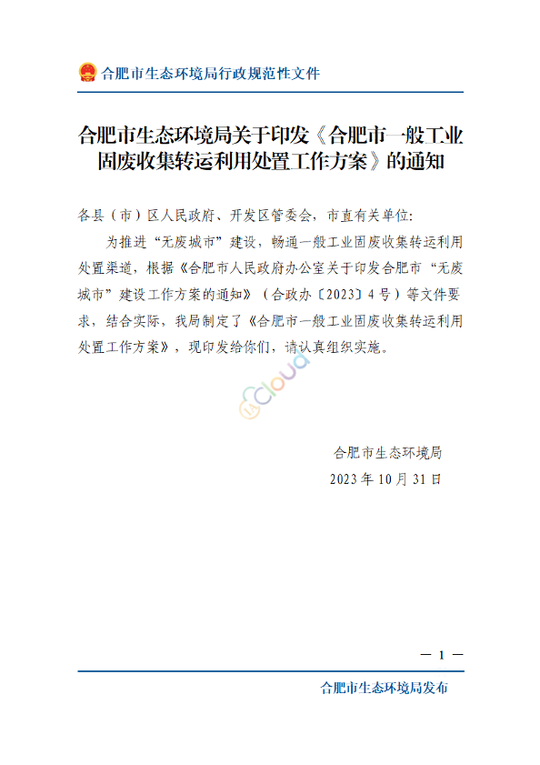 各县(市)区人民政府、开发区管委会,市直有关单位: 为推进“无废城市”建设,畅通一般工业固废收集转运利用处置渠道,根据《合肥市人民政府办公室关于印发合肥市“无废城市”建设工作方案的通知》(合政办〔2023〕4号)等文件要求,结合实际,我局制定了《合肥市一般工业固废收集转运利用处置工作方案》,现印发给你们,请认真组织实施。 合肥市生态环境局 2023年10月31日