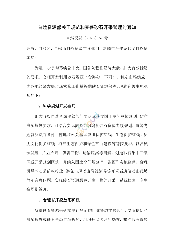 通知是自然资源部发布的关于规范和完善砂石开采管理的政策文件,文件编号为自然资发〔2023〕57号,发布日期为2023年4月10日。通知的主要内容包括以下几个方面: