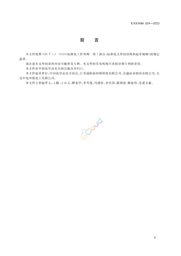 本文件按照 GB/T 1.1— 2020《标准化工作导则 第 1部分:标准化文件的结构和起草规则》的规定 起草 。 请注意本文件的某些内容可能涉及专利 。本文件的发布机构不承担识别专利的责任 。 本文件由中国化学品安全协会提出并归口 。 本文件起草单位:中国化学品安全协会 、江苏瑞恒新材料科技有限公司 、合盛硅业股份有限公司 、太 仓中化环保化工有限公司 。 本文件主要起草人:王路 、王日元 、瞿龙学 、李雪莲 、冯建柱 、李贞国 、陈国清 、陈振伟 、皇甫文豪 。