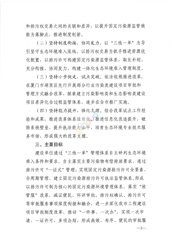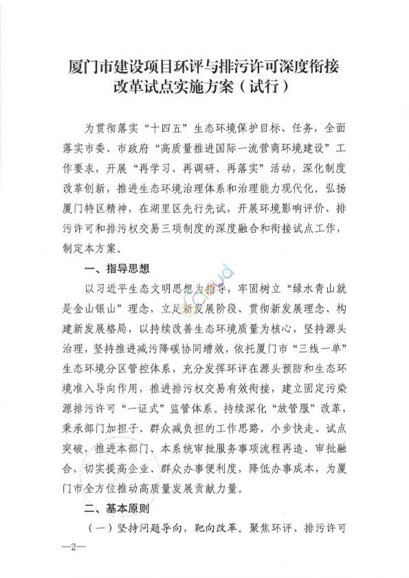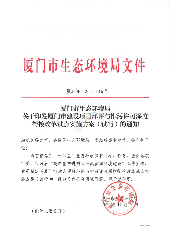 局机关各处室,各驻区生态环境局,直属各事业单位,各有关单位: 为贯彻落实“十四五”生态环境保护目标、任务,全面落实市委、市政府“高质量推进国际一流营商环境建设”工作要求,我局制定《厦门市建设项目环评与排污许可深度衔接改革试点实施方案(试行)》,经局长办公会研究同意,现予以印发。