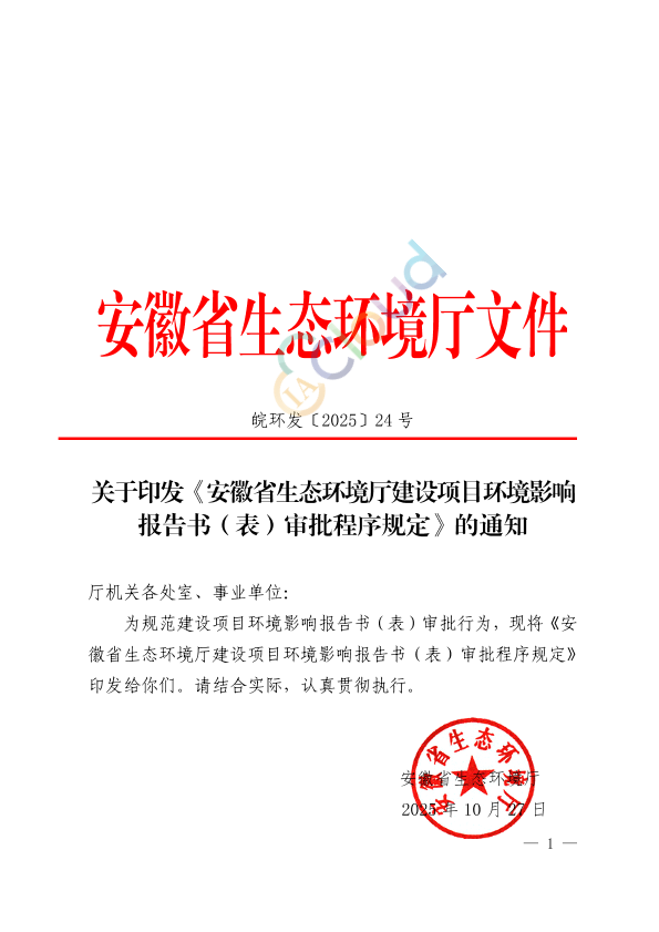 厅机关各处室、事业单位: 为规范建设项目环境影响报告书(表)审批行为,现将《安徽省生态环境厅建设项目环境影响报告书(表)审批程序规定》印发给你们。请结合实际,认真贯彻执行。 安徽省生态环境厅 2025 年10 月27日