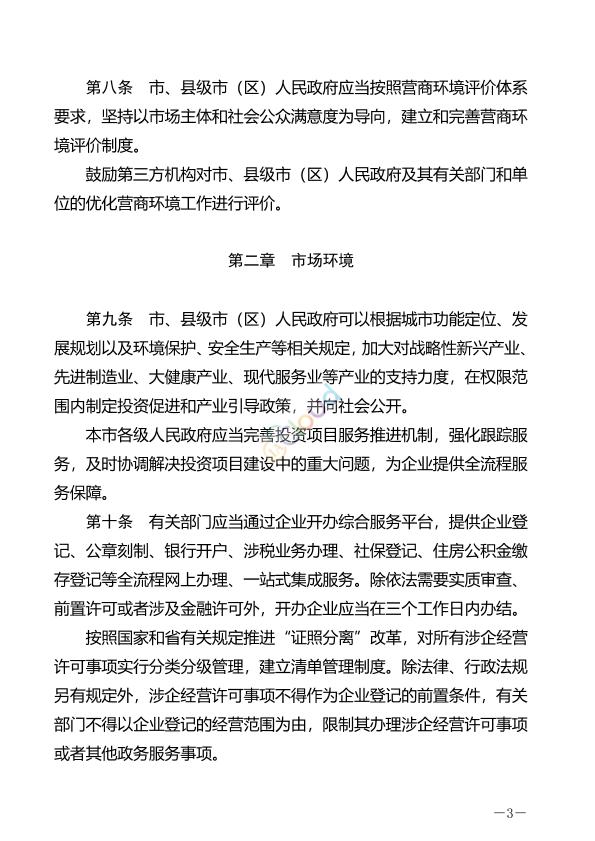 1. 总则:明确了优化营商环境的目的、适用范围、基本原则和政府职责。强调市场化、法治化、国际化原则,以及创新体制机制、优化政务服务等