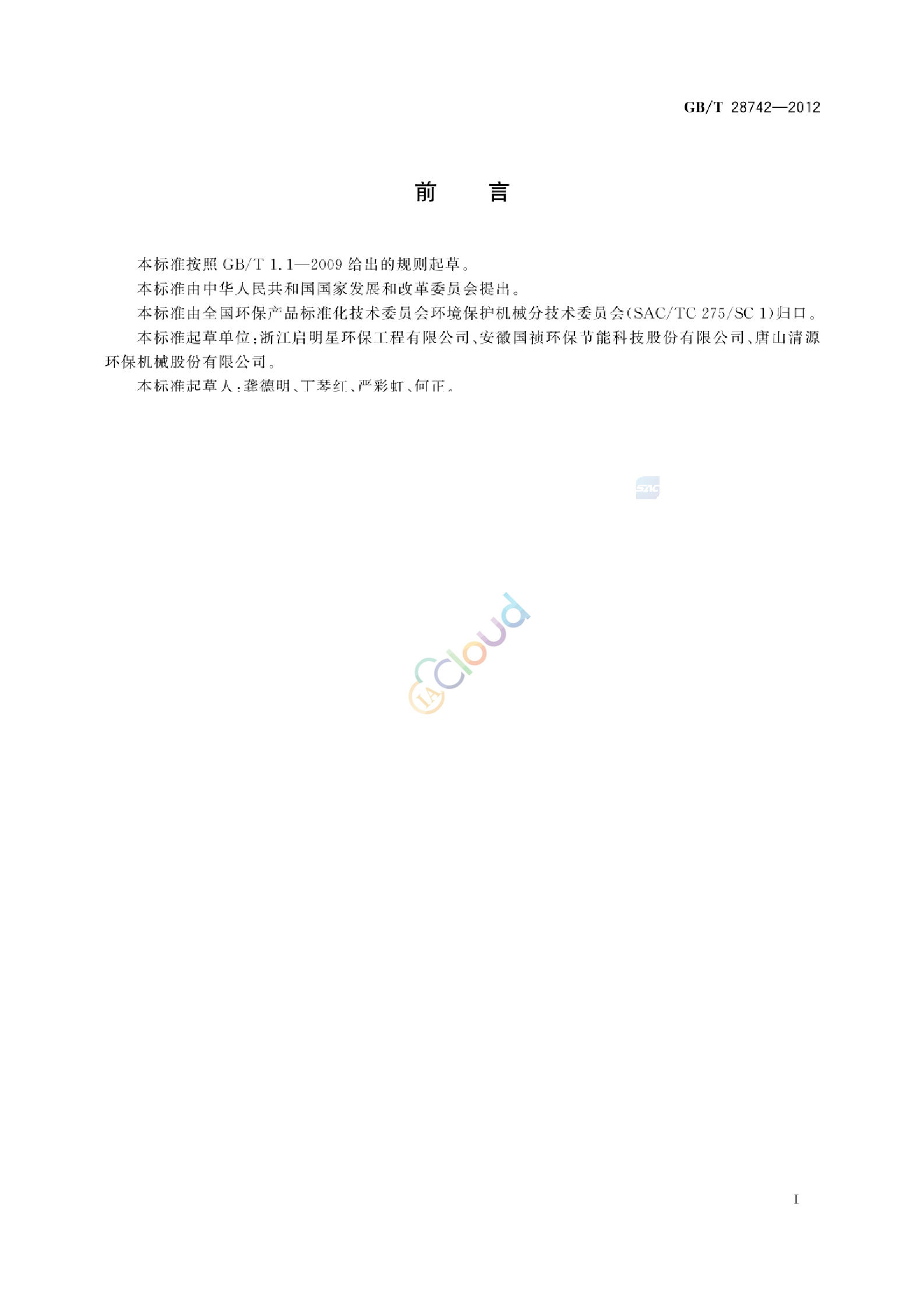 本标准按照GB/T1.1-2009给出的规则起草。 本标准由中华人民共和国国家发展和改革委员会提出。 本标准由全国环保产品标准化技术委员会环境保护机械分技术委员会(SAC/TC275/SC1)归口。