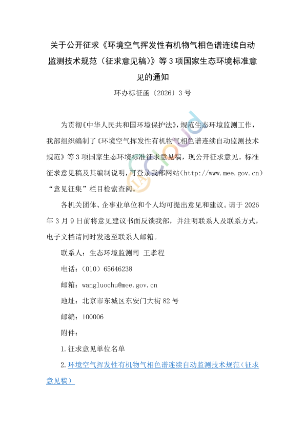 为贯彻《中华人民共和国环境保护法》,规范生态环境监测工作,我部组织编制了《环境空气挥发性有机物气相色谱连续自动监测技术规范》等3项国家生态环境标准征求意见稿,现公开征求意见。标准征求意见稿及其编制说明,可登录我部网站(http://www.mee.gov.cn)“意见征集”栏目检索查阅。