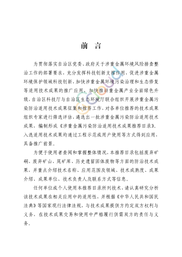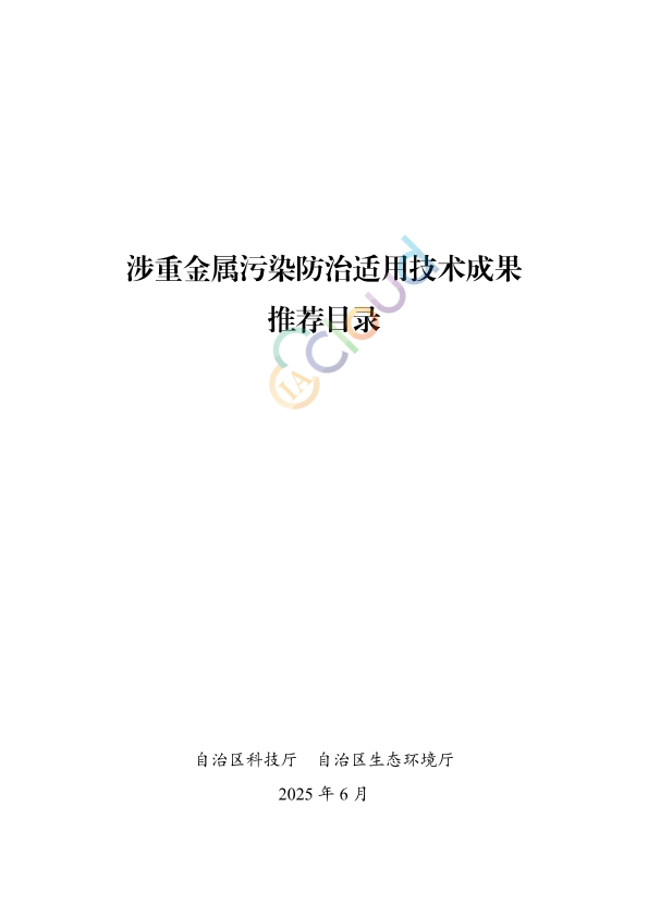 各有关单位: 为贯彻落实自治区党委、政府关于涉重金属环境风险排查整治工作的决策部署,充分发挥科技创新支撑作用,加快涉重金属环境污染防治适用技术成果的推广应用,经组织专家对科技部推荐的重大科技计划成果进行筛选评估,我们编制形成了《涉重金属污染防治适用技术成果推荐目录》,现予发布。 附件:涉重金属污染防治适用技术成果推荐目录.wps 广西壮族自治区科学技术厅 广西壮族自治区生态环境厅 2025年6月11日