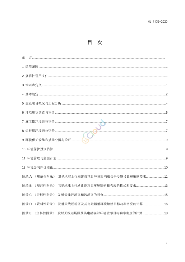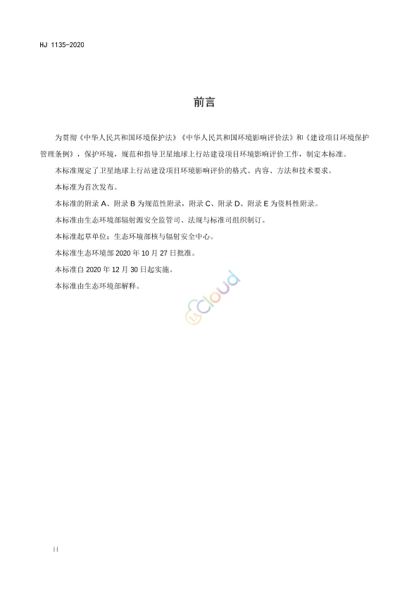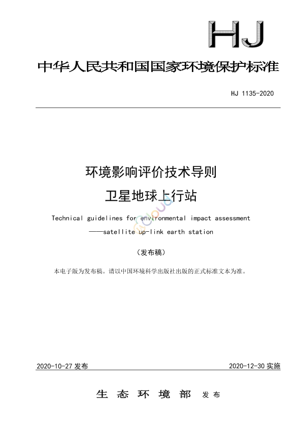 为贯彻《中华人民共和国环境保护法》《中华人民共和国环境影响评价法》和《建设项目环境保护管理条例》,保护环境,规范和指导卫星地球上行站建设项目环境影响评价工作,制定本标准。 本标准规定了卫星地球上行站建设项目环境影响评价的格式、内容、方法和技术要求。本标准为首次发布。 本标准的附录 A、附录 B 为规范性附录,附录 C、附录 D、附录 E 为资料性附录。 本标准由生态环境部辐射源安全监管司、法规与标准司组织制订。 本标准起草单位:生态环境部核与辐射安全中心。 本标准生态环境部 2020 年 10 月 27 日批准。 本标准自 2020 年12 月 30 日起实施。 本标准由生态环境部解释。