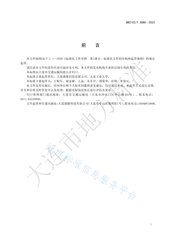 本文件按照GB/T 1.1 -2020 《标准化工作导则第1 部分:标准化文件的结构和起草规则》的规定起草。 请注意本文件的某些内容可能涉及专利。本文件的发布机构不承担识别专利的责任。 本标准由大连市交通运输局提出并归口。 本标准主要起草单位:大连港隆科技有限公司、大连工业大学。 本标准主要起草人:王岐军、谢金鉀、王晶、丛东升、胡爱华、彭锋、单庆元。 本文件发布实施后,任何单位和个人如有问题和意见建议,均可通过来电、来函等方式进行反馈,有关单位将及时答复并认真处理,根据实际情况依法进行评估及复审。 归口管理部门通讯地址:大连市交通运输局(大连市沙河口区中山路401号),联系电话:0411-84340940. 文件起草单位通讯地址:大连港隆科技有限公司(大连市中山区港湾街1号),联系电话:18940919808.