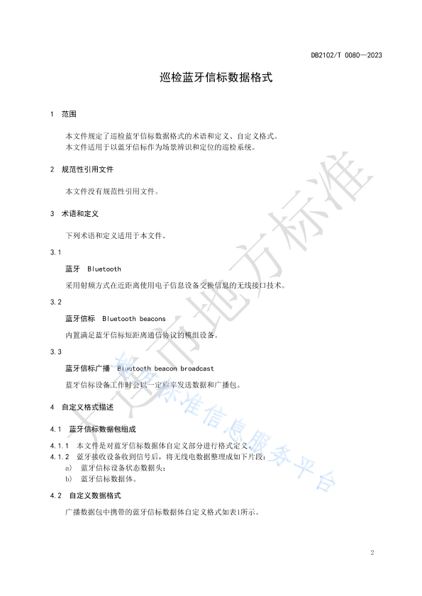 本文件规定了巡检蓝牙信标数据格式的术语和定义、自定义格式。 本文件适用于以蓝牙信标作为场景辨识和定位的巡检系统。
