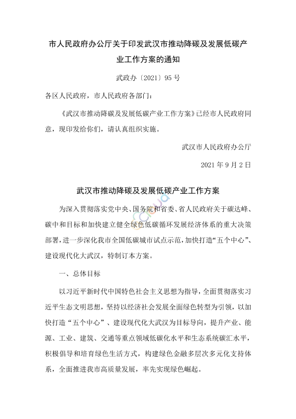 各区人民政府,市人民政府各部门: 《武汉市推动降碳及发展低碳产业工作方案》已经市人民政府同意,现印发给你们,请认真组织实施。 武汉市人民政府办公厅 2021年9月2日