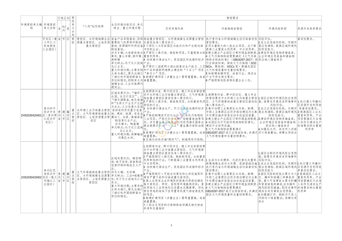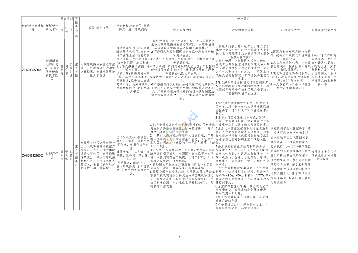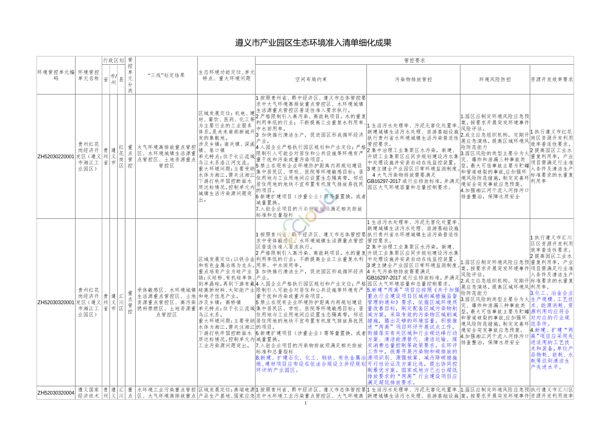 各县(市、区)人民政府,新蒲新区管委会,市直各有关单位: 为坚决落实《贵州省人民政府关于实施“三线一单”生态环境分区管控的通知》(黔府发〔2020〕12号)、《市人民政府关于印发遵义市“三线一单”生态环境分区管控实施方案的通知》(遵府发〔2020〕10号)等文件精神,按照《贵州省长江经济带战略环境影响评价项目协同领导小组办公室关于进一步细化生态环境准入清单的通知》(黔环环评〔2020〕20号)要求,我局组织完成遵义市产业园区生态环境准入清单细化工作,现将成果发布,请结合实际,根据相关规定组织实施。 附件:遵义市产业园区生态环境准入清单细化成果 2021年8月31日