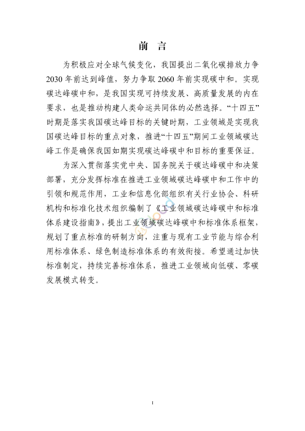 各省、自治区、直辖市工业和信息化主管部门,有关行业协会、标准化技术组织和专业机构: 为切实发挥标准对工业领域碳达峰碳中和的支撑和引领作用,工业和信息化部依据《新产业标准化领航工程实施方案(2023-2035年)》《工业领域碳达峰实施方案》《建立健全碳达峰碳中和标准计量体系实施方案》等,组织编制了《工业领域碳达峰碳中和标准体系建设指南》。现印发给你们,请结合本地区、本行业、本领域实际,在标准化工作中贯彻执行。 工业和信息化部办公厅 2024年2月4日