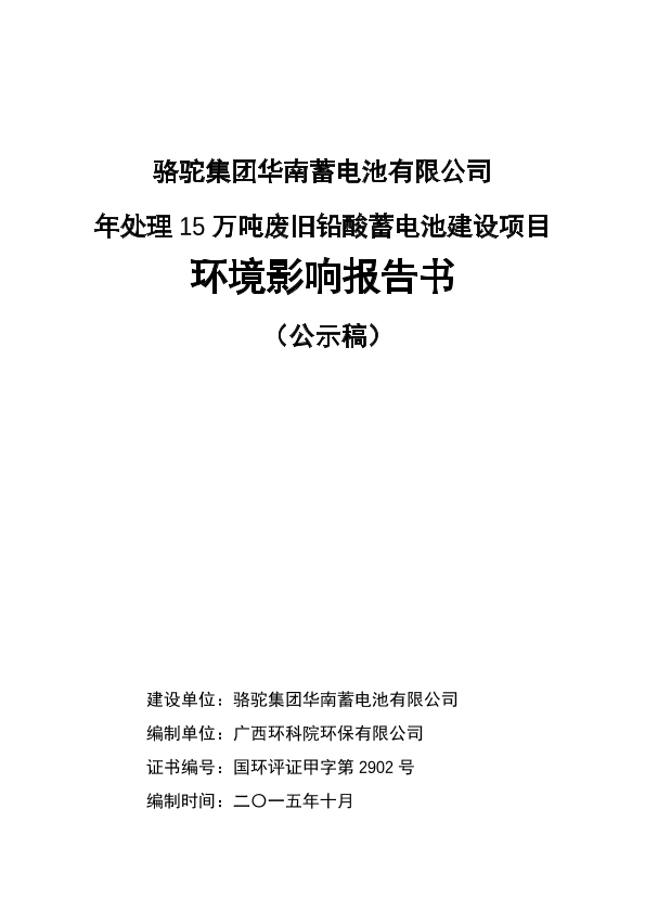 骆驼集团华南蓄电池有限公司年处理15万吨废旧铅酸蓄电池建设项目环境影响报告书审批670674225