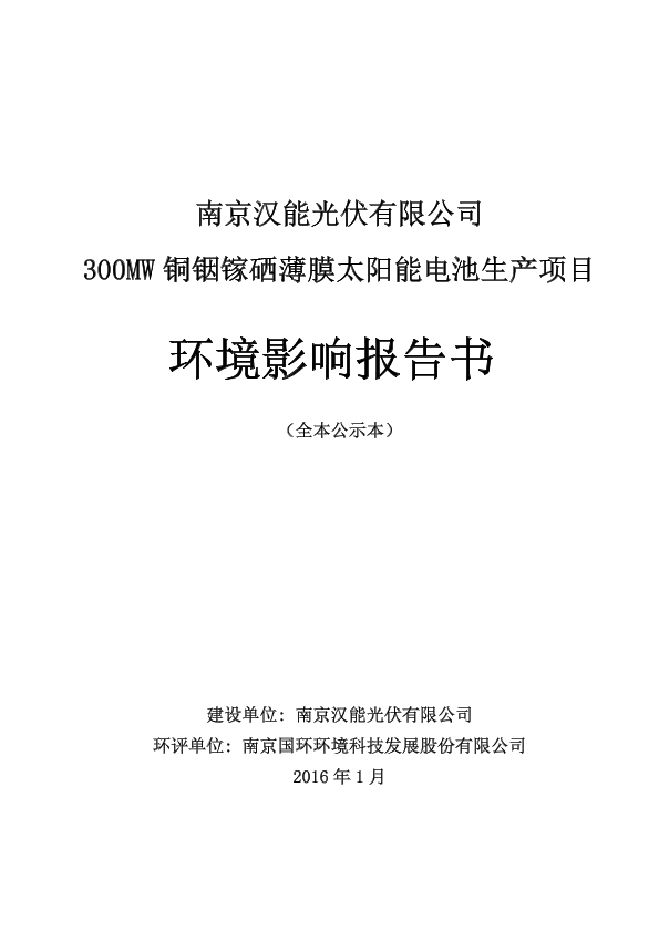 南京汉能光伏有限公司 300MW 铜铟镓硒薄膜太阳能电池生产项目环境影响报告书6939.pdf