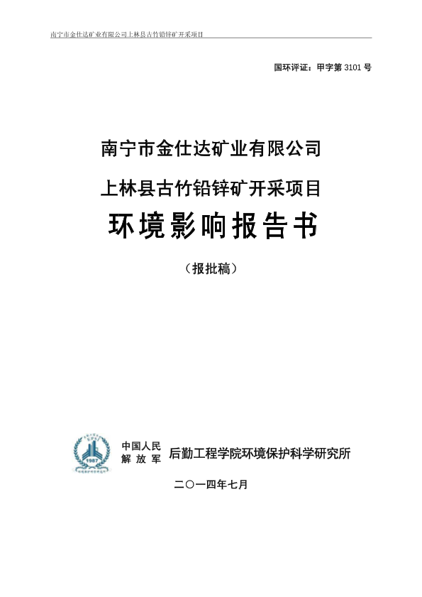 南宁市金仕达矿业有限公司上林县古竹铅锌矿开采建设项目环境影响报告书审批