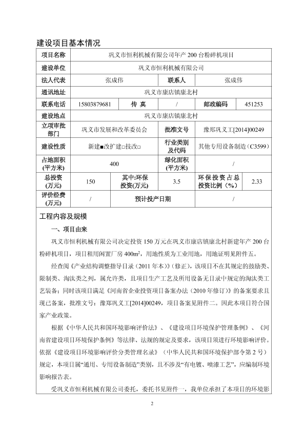 康店镇康北村-年产200台粉碎机项目报告表3864