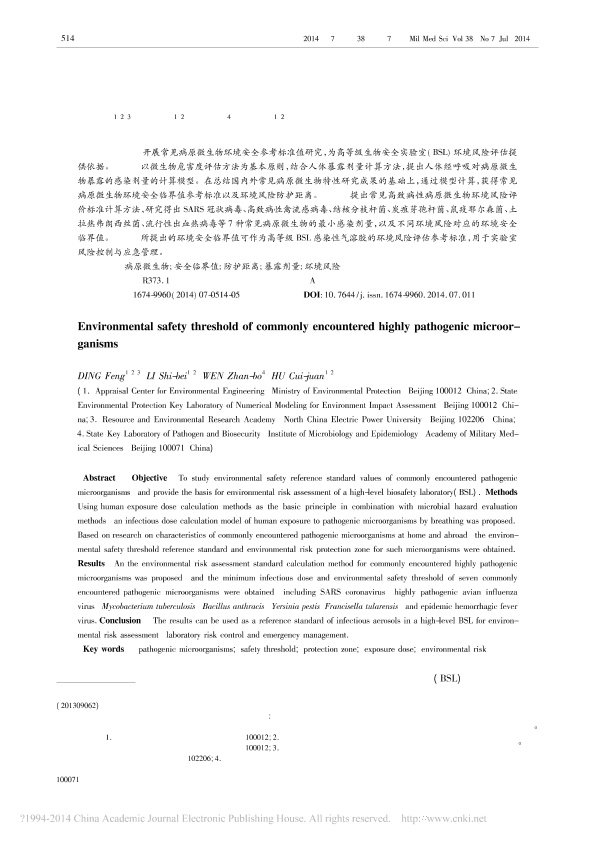 常见高致病性病原微生物环境安全临界值研究_丁峰.pdf
