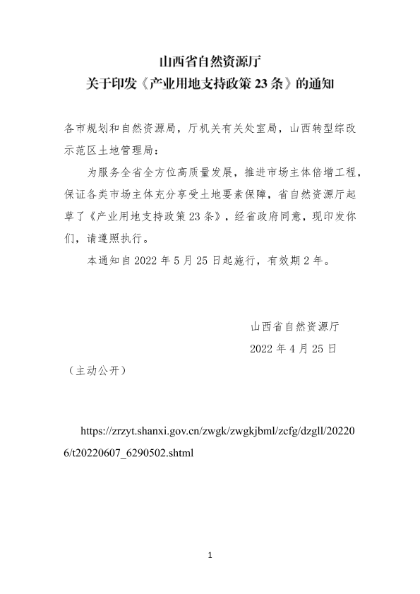 山西省自然资源厅关于印发《产业用地支持政策23条》的通知