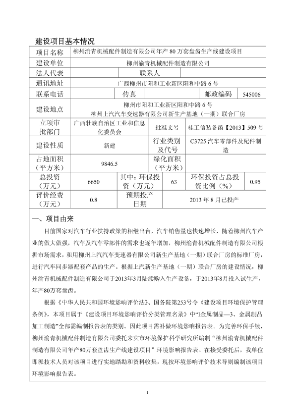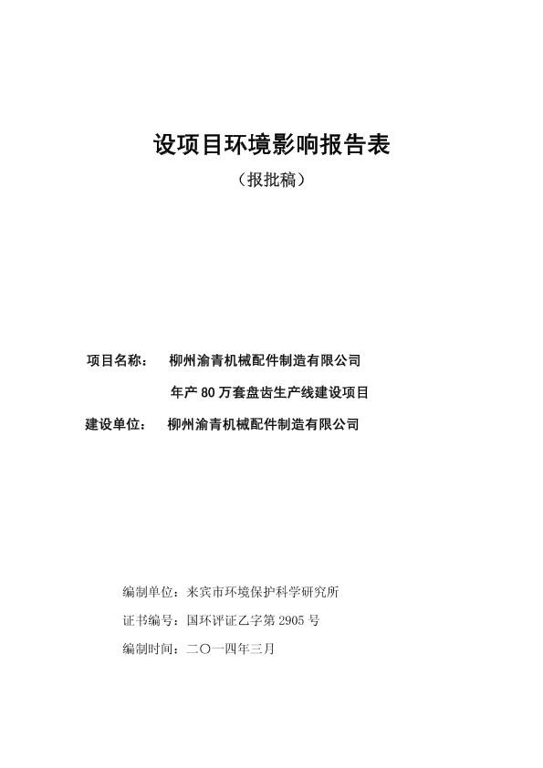 1柳州渝青机械配件制造有限公司年产80万套盘齿生产线建设项目环境影响报告表审批