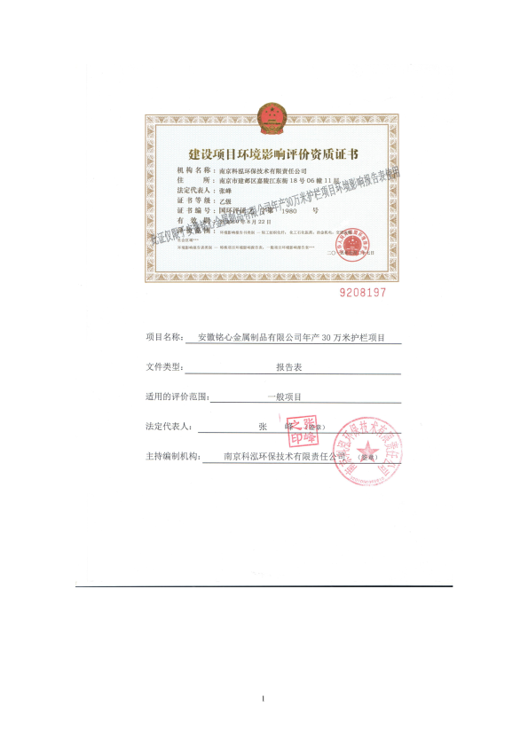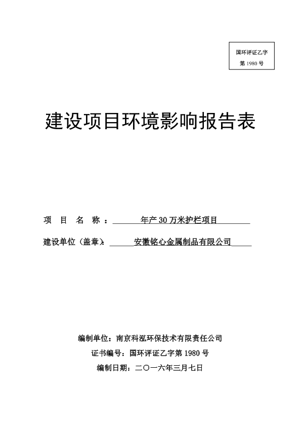 《安徽铭心金属制品有限公司年产30万米护栏项目环境影响报告表》受理公示a14649a9823