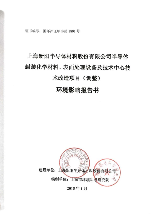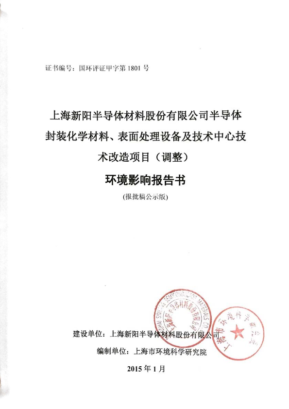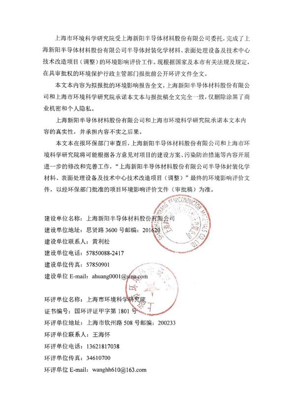 1、上海新阳半导体材料股份有限公司半导体封装化学材料、表面处理设备及技术中心技术改造项目(调整)环境影响评价报批前公示2383