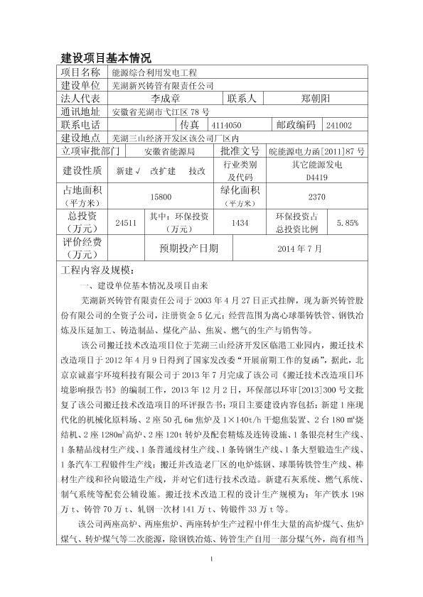 芜湖新兴铸管有限责任公司能源综合利用发电工程环境影响报告表公示a35650a5337 公开
