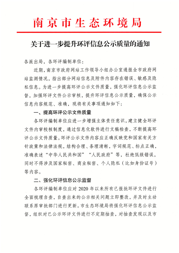 1、南京市生态环境局关于进一步提升环评信息公示质量的通知