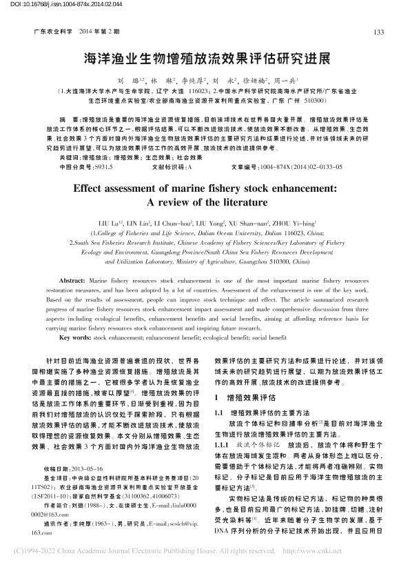 海洋渔业生物增殖放流效果评估研究进展_刘璐 公开