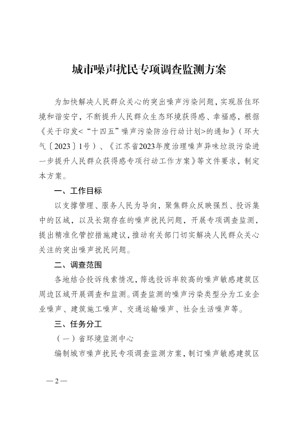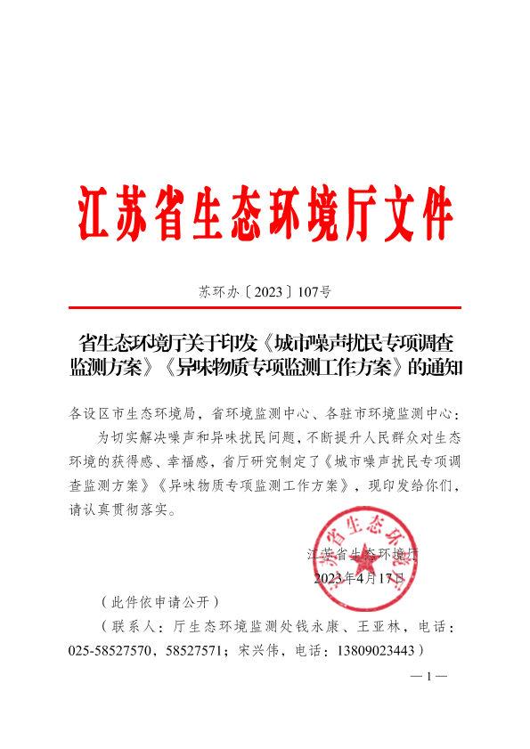 《省生态环境厅关于印发〈城市噪声扰民专项调查监测方案〉〈异味物质专项监测工作方案〉的通知》(苏环办[2023]107号) 公开