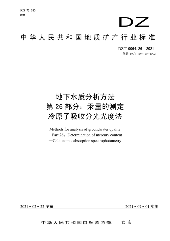 DZ/T 0064.26-2021 地下水质分析方法 第26部分:汞量的测定冷原子吸收分光光度法 公开
