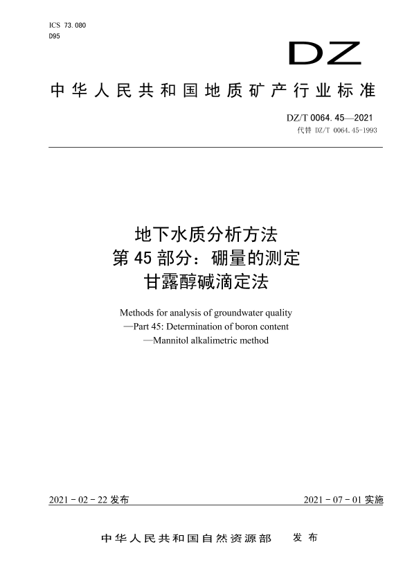 DZ/T 0064.45-2021 地下水质分析方法 第45部分:硼量的测定甘露醇碱滴定法 公开