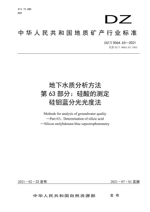 DZ/T 0064.63-2021 地下水质分析方法 第63部分:硅酸的测定硅钼蓝分光光度法 公开