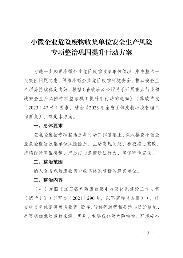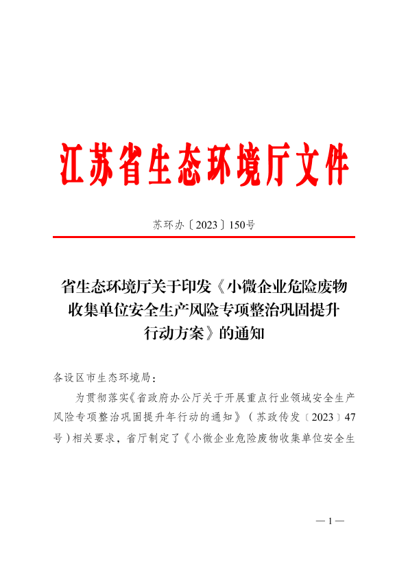 省生态环境厅关于印发《小微企业危险废物收集单位安全生产风险专项整治巩固提升行动方案》的通知(苏环办〔2023〕150号) 公开
