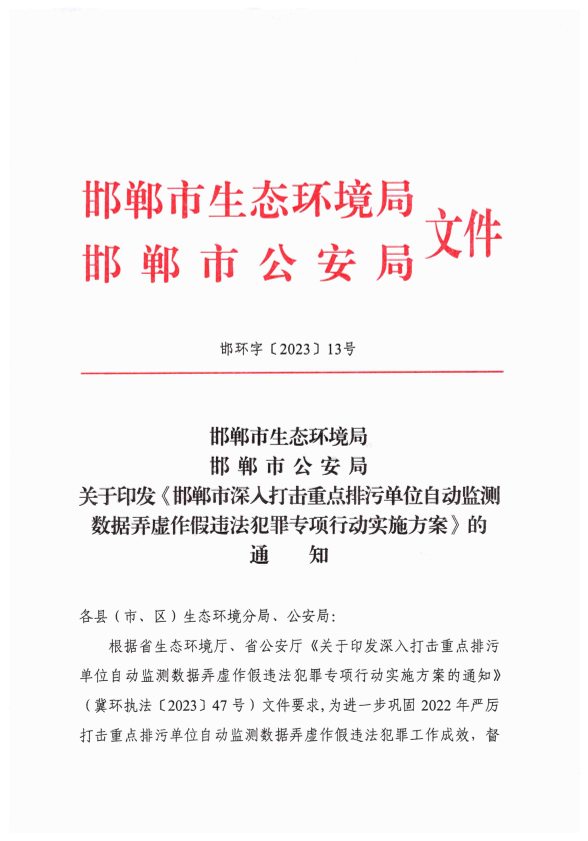 邯环字〔2023〕13号邯郸市生态环境局邯郸市公安局关于印发《邯郸市深入打击重点排污单位自动监测数据弄虚作假违法犯罪专项行动实施方案》的通知.pdf