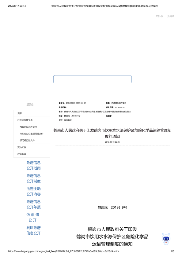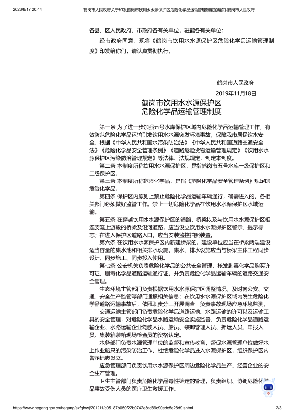 鹤岗市人民政府关于印发鹤岗市饮用水水源保护区危险化学品运输管理制度的通知(鹤政规[2019]9号).pdf