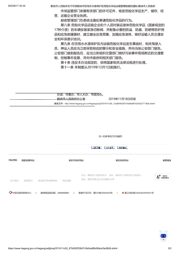鹤岗市人民政府关于印发鹤岗市饮用水水源保护区危险化学品运输管理制度的通知(鹤政规[2019]9号)